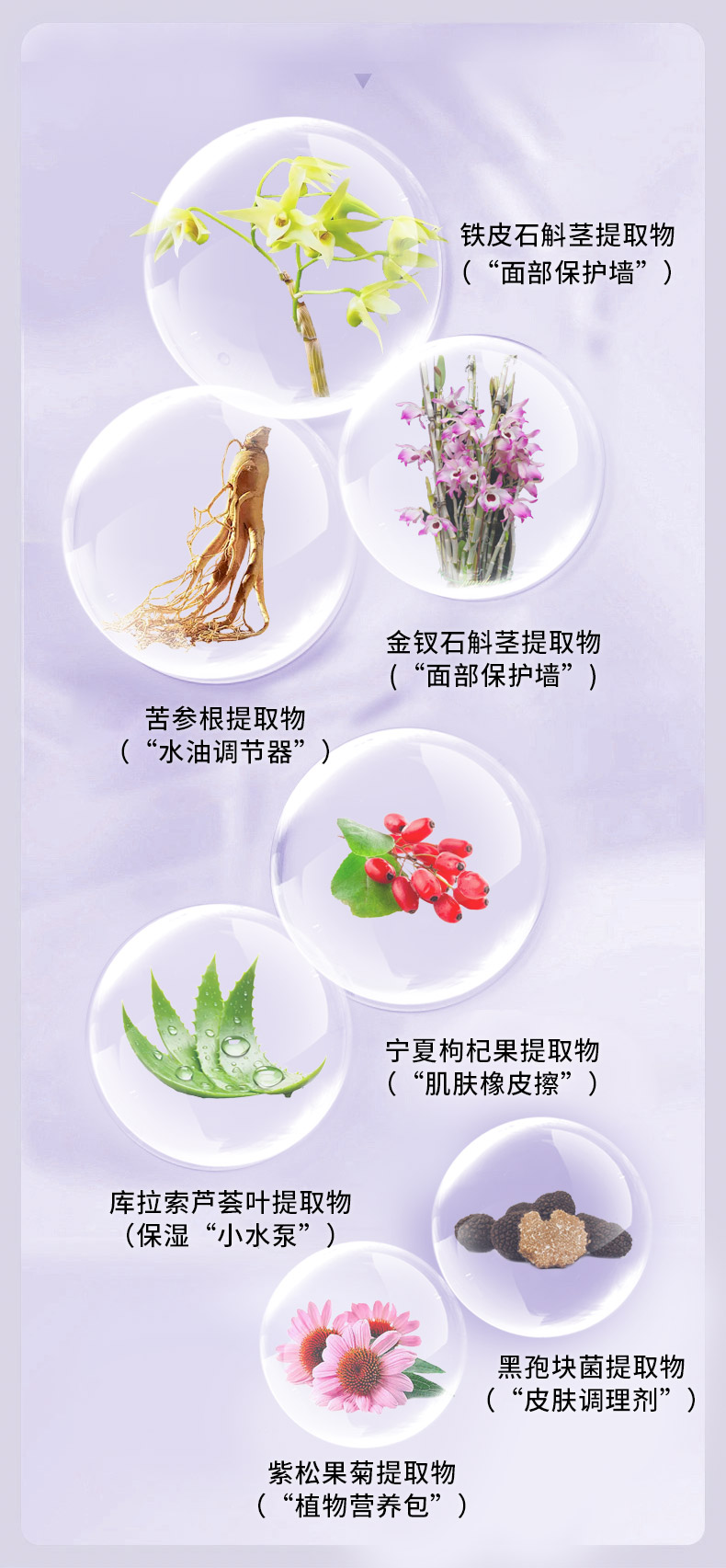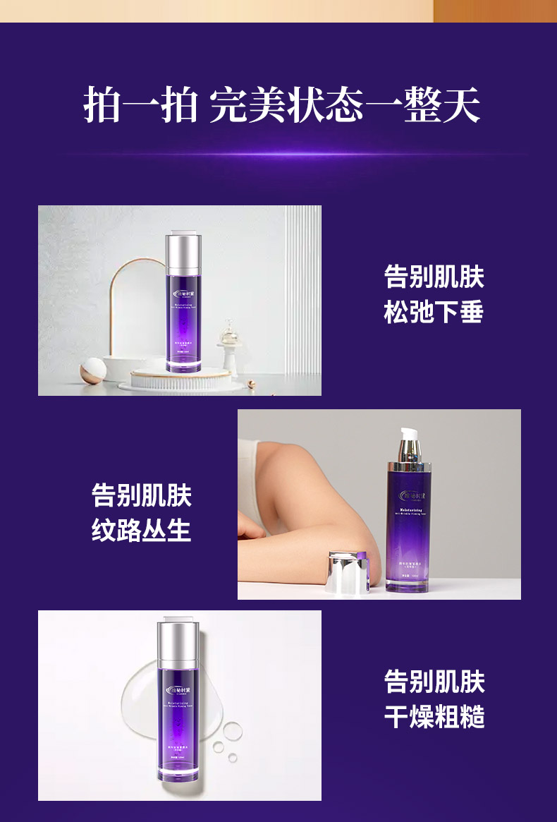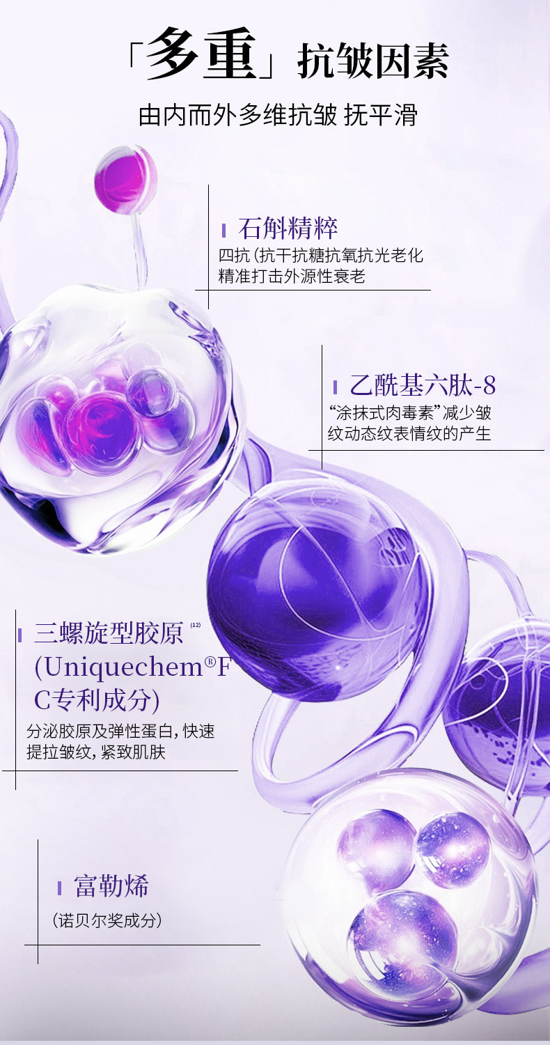 轻盈水状清爽质地,一抹好吸收,亲肤性强,具有丝质般的爽滑感并使肌肤保持持久的柔软度,柔润滋养肌肤;添加专利成分酵母菌发酵产物滤液复配铁皮石斛茎提取物,有效促进弹性蛋白酶产生,展现极佳的紧肤效果,令肌肤澎润饱满;另外搭配专利成分胶原、纤连蛋白及酰基六肽-8,促进胶原蛋白合成,层层滋养,内外兼修,淡化细纹,弹润紧致;