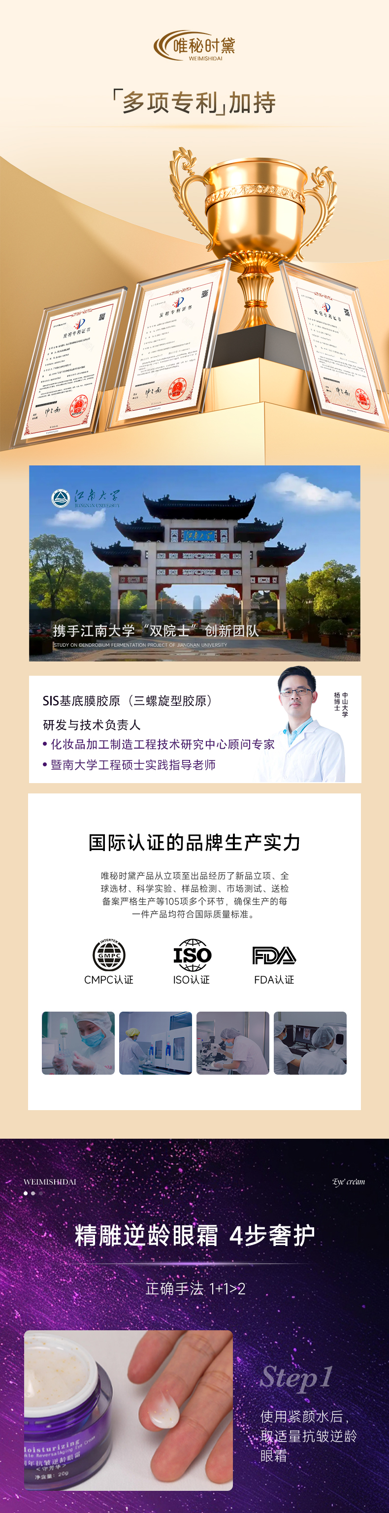 爽滑质地注入黄金精华,焕新双眸,充盈细纹,有效缓解眼周老化速度,打造澎润立体眼周;蕴含霍霍巴籽油植物精粹,滋润眼周肌肤,使眼周饱满弹润,增强肌肤弹性;富勒烯和乙酰基六肽-8多维修护,改善细小纹路,一抹隐匿细纹,弹润紧致眼周;添加红没药醇减少黑色素、淡化熊猫眼,舒缓消炎,安心养护眼周肌肤;