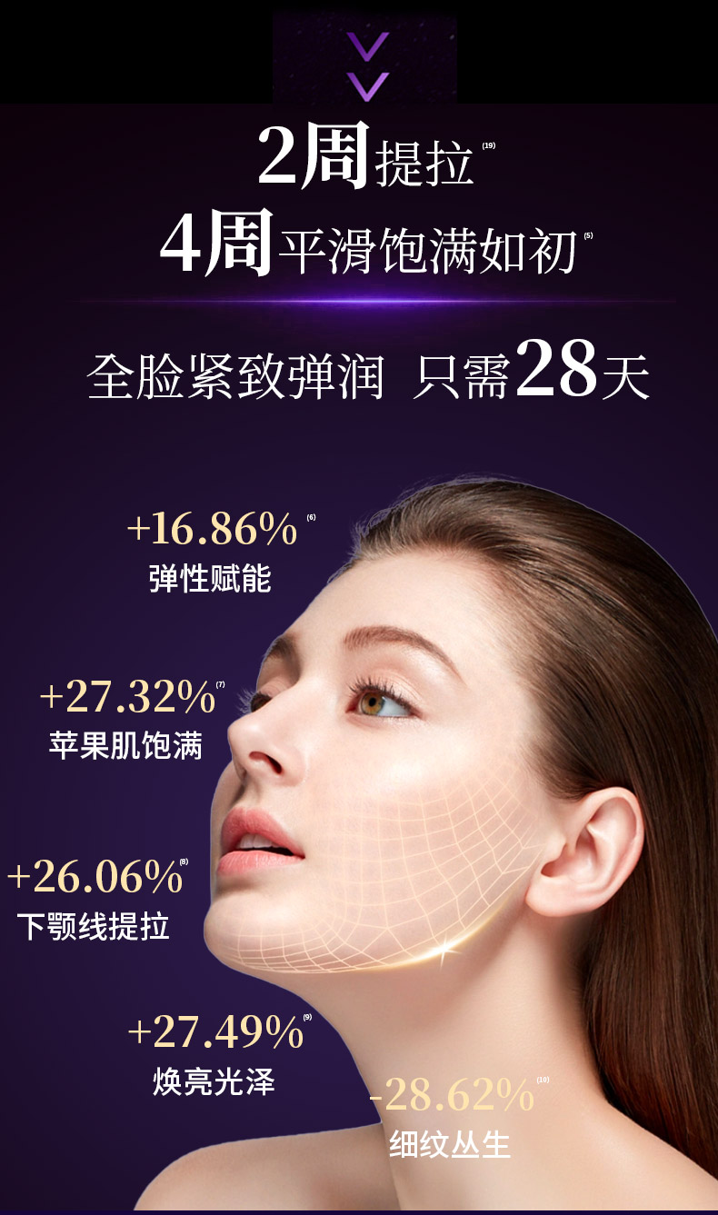 轻盈水状清爽质地,一抹好吸收,亲肤性强,具有丝质般的爽滑感并使肌肤保持持久的柔软度,柔润滋养肌肤;添加专利成分酵母菌发酵产物滤液复配铁皮石斛茎提取物,有效促进弹性蛋白酶产生,展现极佳的紧肤效果,令肌肤澎润饱满;另外搭配专利成分胶原、纤连蛋白及酰基六肽-8,促进胶原蛋白合成,层层滋养,内外兼修,淡化细纹,弹润紧致;