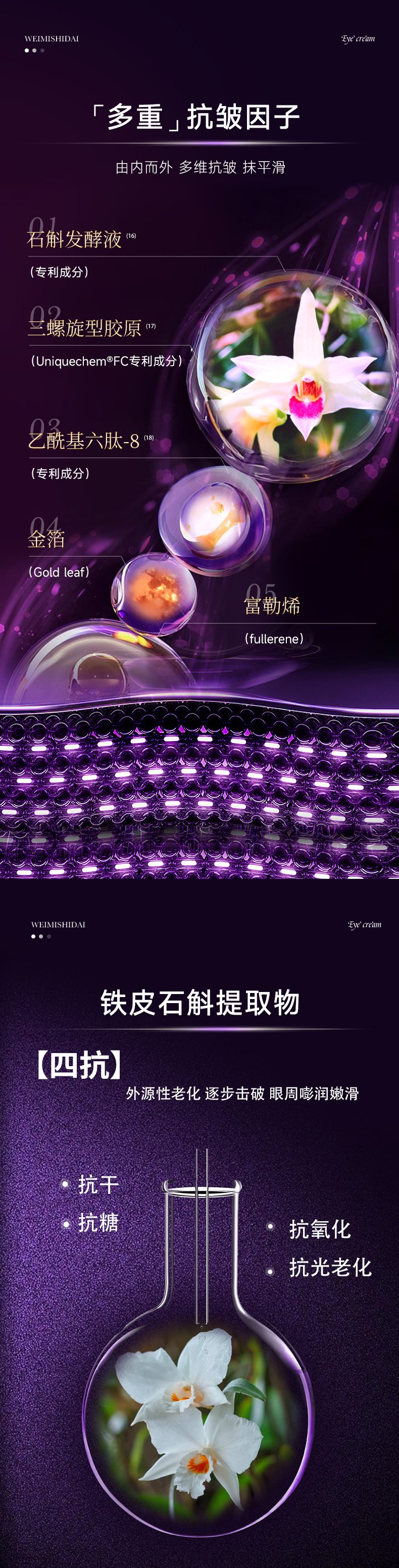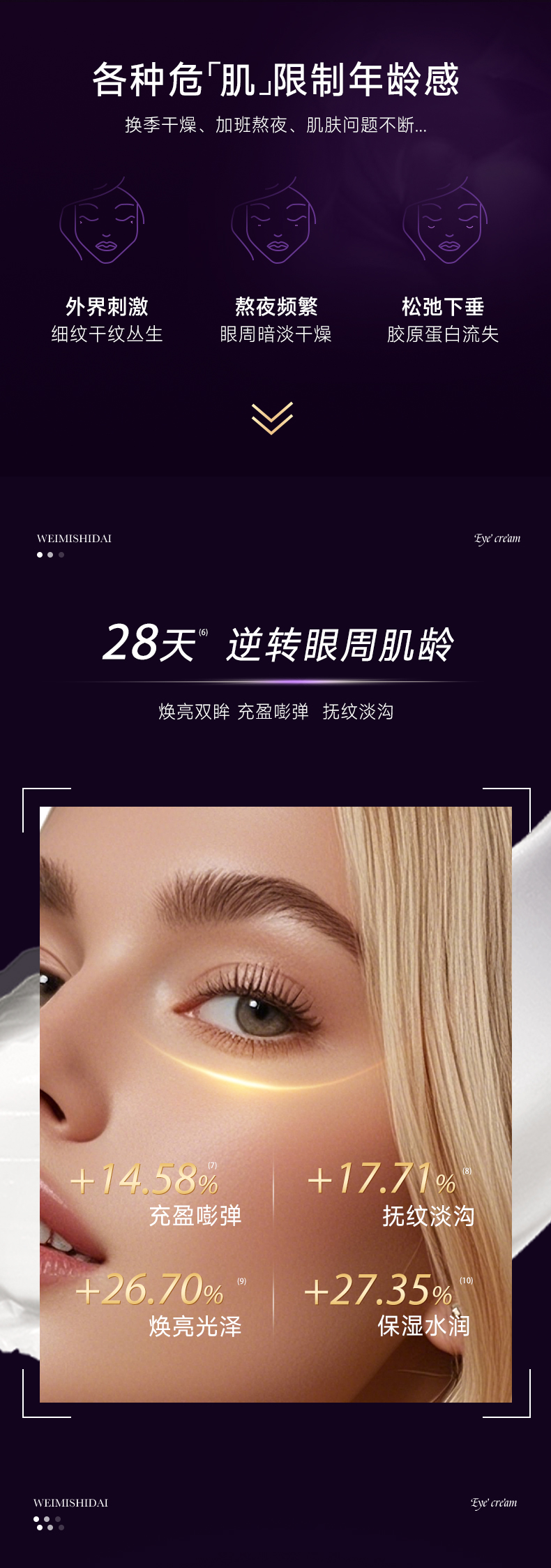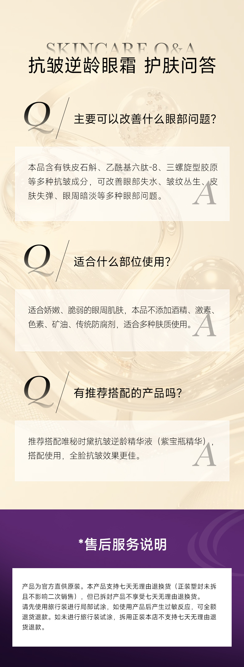 爽滑质地注入黄金精华,焕新双眸,充盈细纹,有效缓解眼周老化速度,打造澎润立体眼周;蕴含霍霍巴籽油植物精粹,滋润眼周肌肤,使眼周饱满弹润,增强肌肤弹性;富勒烯和乙酰基六肽-8多维修护,改善细小纹路,一抹隐匿细纹,弹润紧致眼周;添加红没药醇减少黑色素、淡化熊猫眼,舒缓消炎,安心养护眼周肌肤;