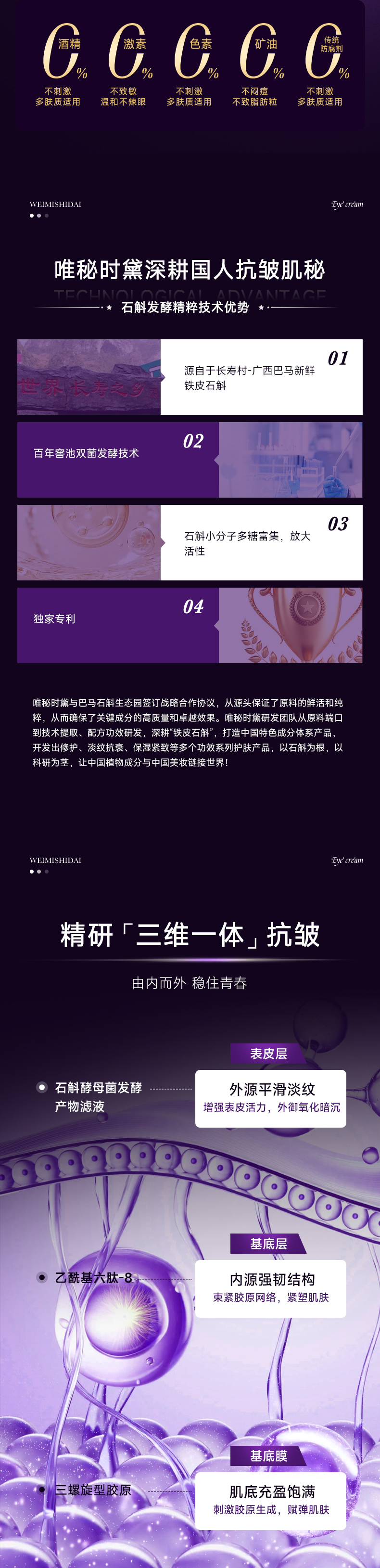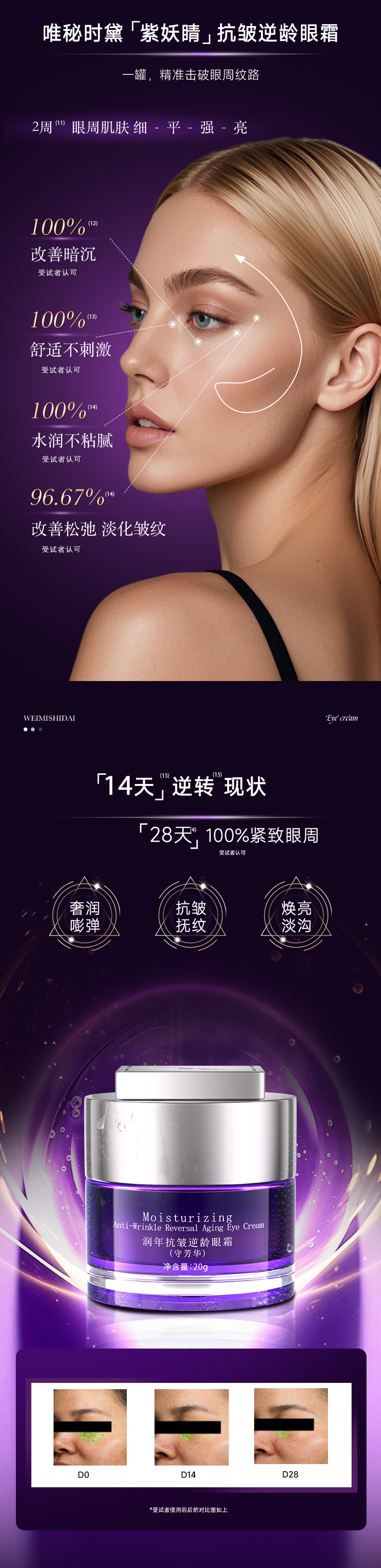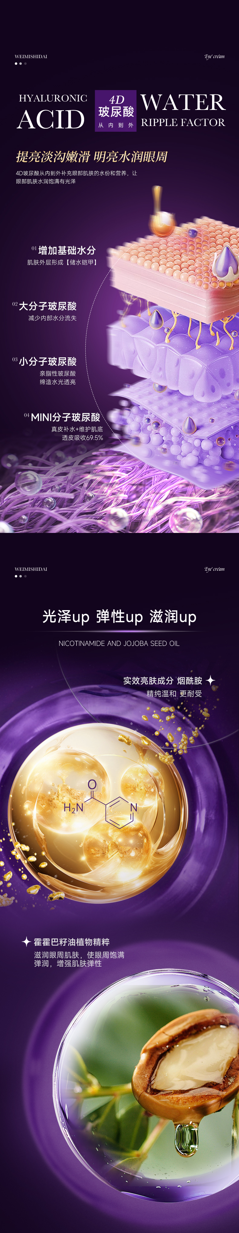 爽滑质地注入黄金精华,焕新双眸,充盈细纹,有效缓解眼周老化速度,打造澎润立体眼周;蕴含霍霍巴籽油植物精粹,滋润眼周肌肤,使眼周饱满弹润,增强肌肤弹性;富勒烯和乙酰基六肽-8多维修护,改善细小纹路,一抹隐匿细纹,弹润紧致眼周;添加红没药醇减少黑色素、淡化熊猫眼,舒缓消炎,安心养护眼周肌肤;